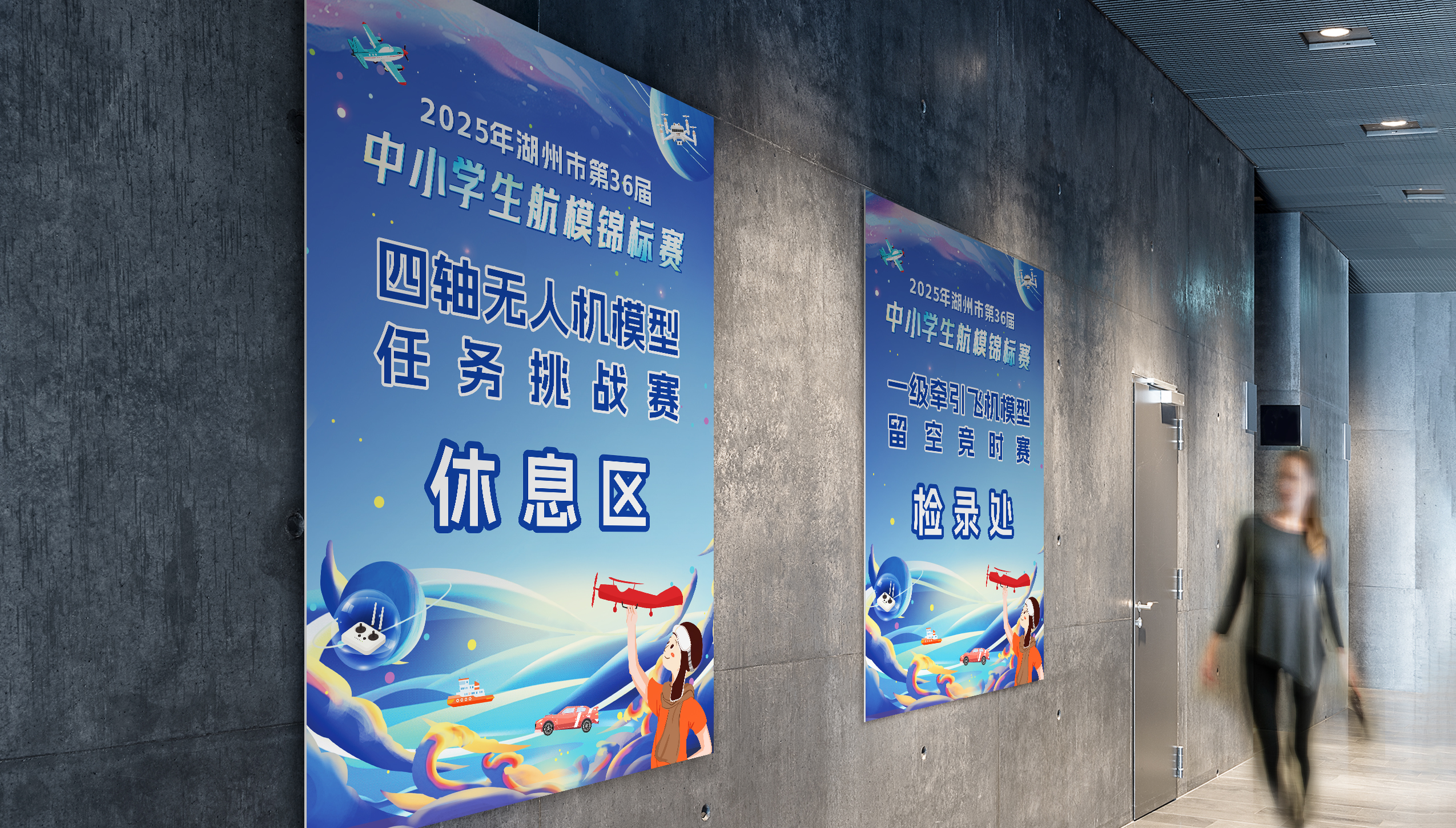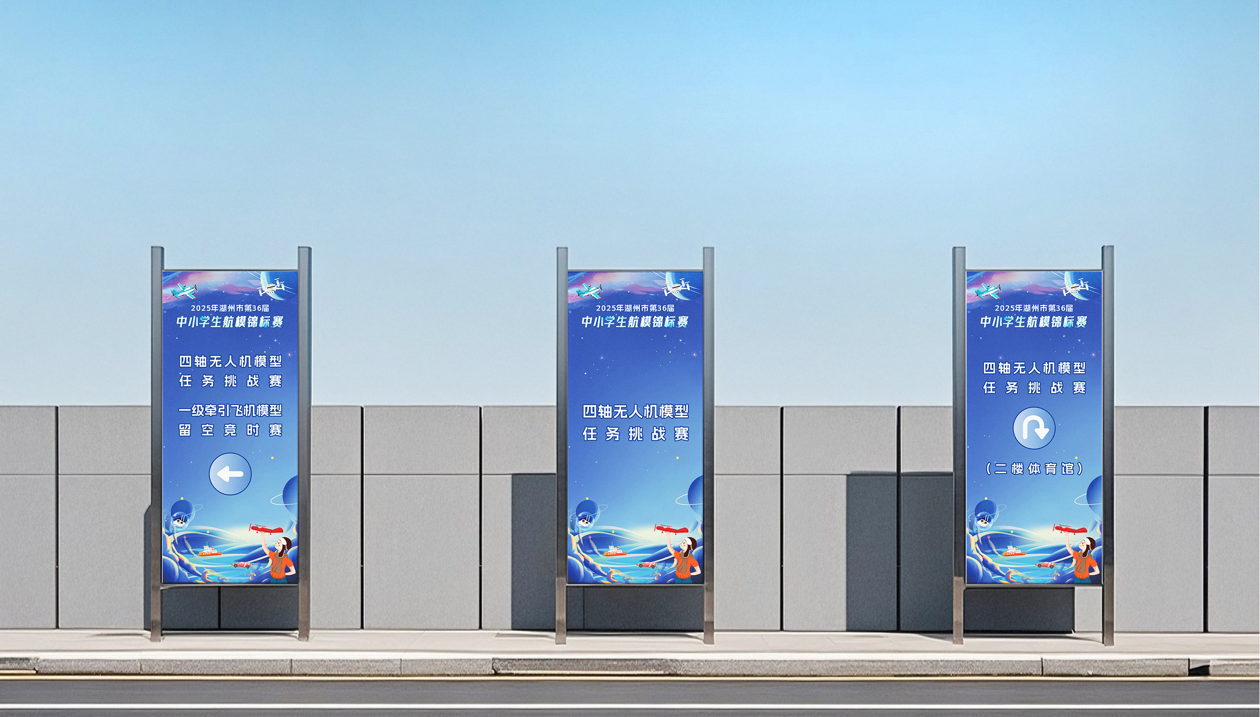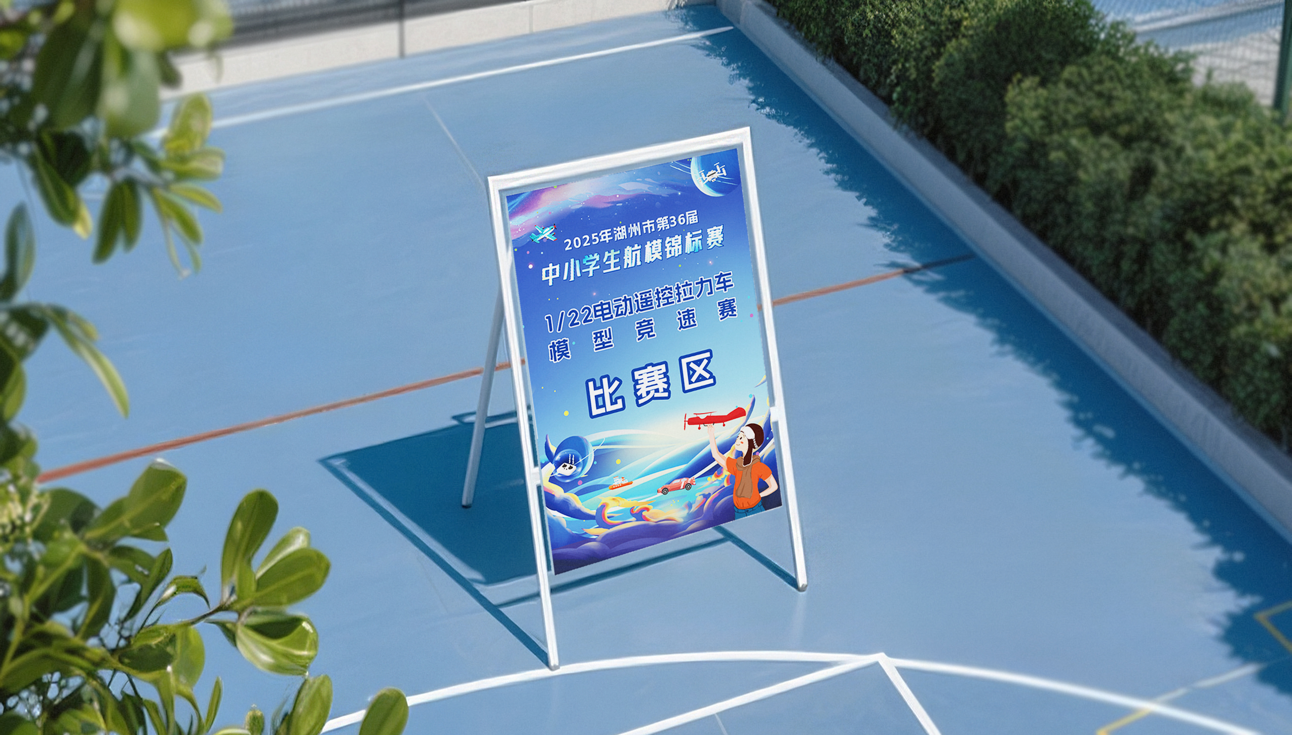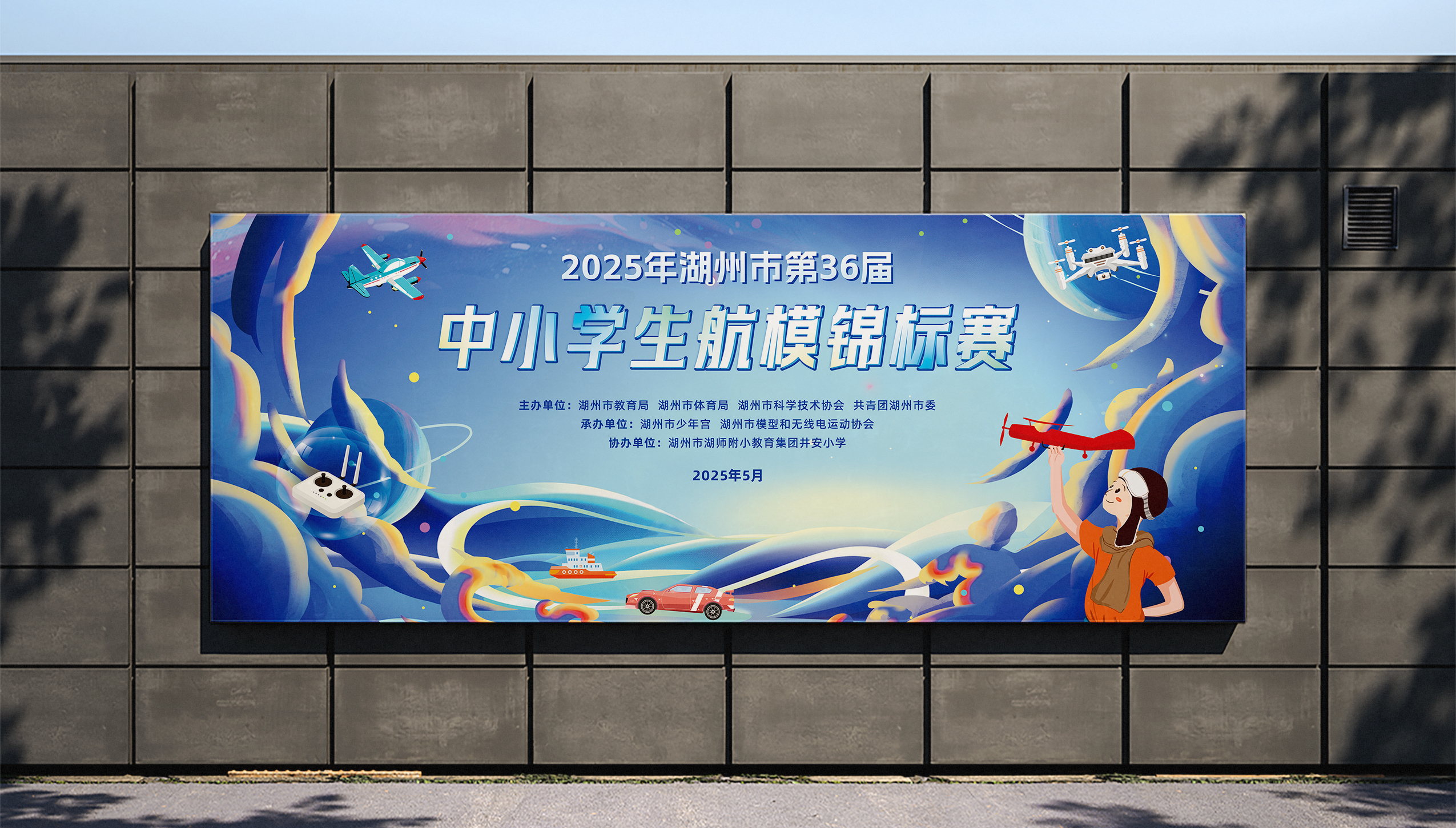 该活动的画面将电动遥控舰艇、电动遥控拉力车、四轴无人机、一级牵引飞机这些比赛项目融入到浩瀚天空,点缀太空元素,不失趣味的同时增加了科技感,有着憧憬未来,突破自我,拼搏向前的含义,整体画面以天空蓝作为主旋律,画面活泼,紧扣主旨,精准定位面向人群,简洁明了,易于宣传。
