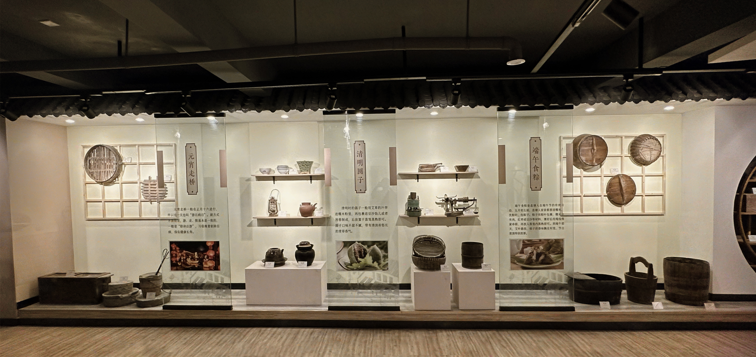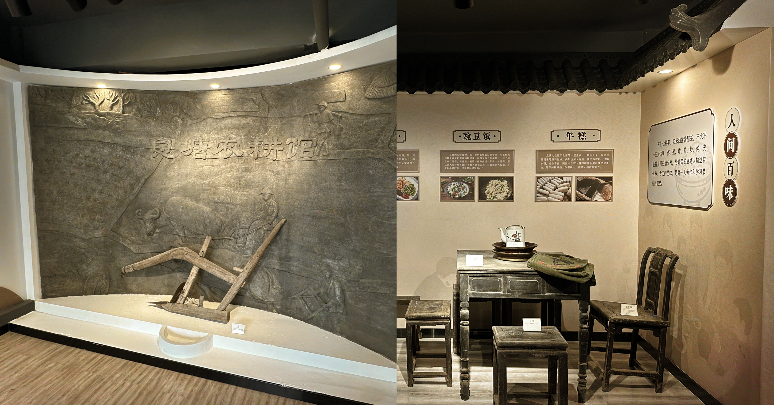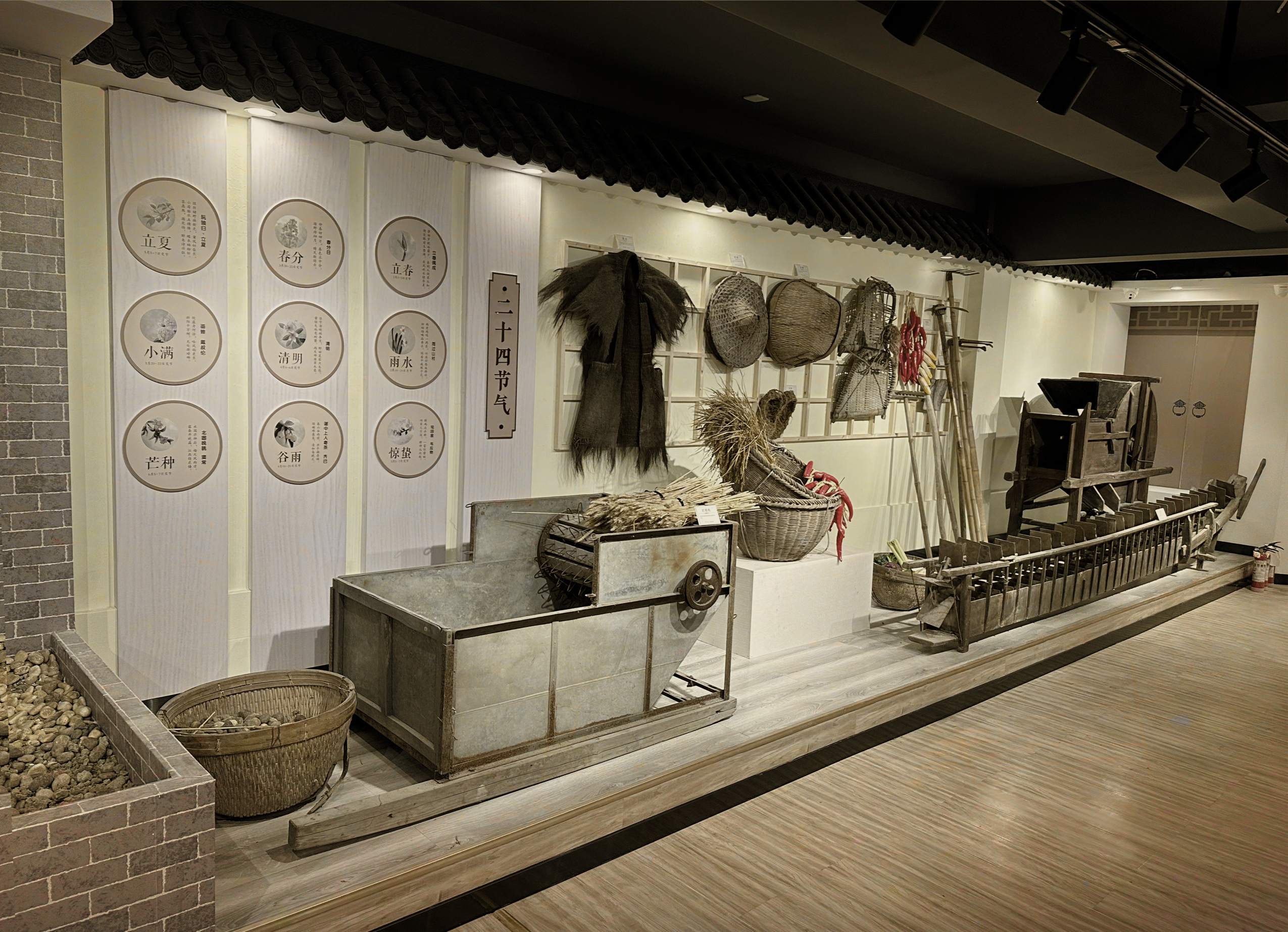 息塘村农耕文化博物馆设计以"梦里老家 息塘印象"为主题,在保留原有农具展示、农耕、织布场景等核心展区的基础上,对参观动线进行优化升级。以传统农耕时序为叙事脉络,划分为"日出而作"、"日暮而息"、"田园水乡"三大主题展区,通过场景复原、文物展陈相结合的方式,系统呈现浙北水乡农耕文明。