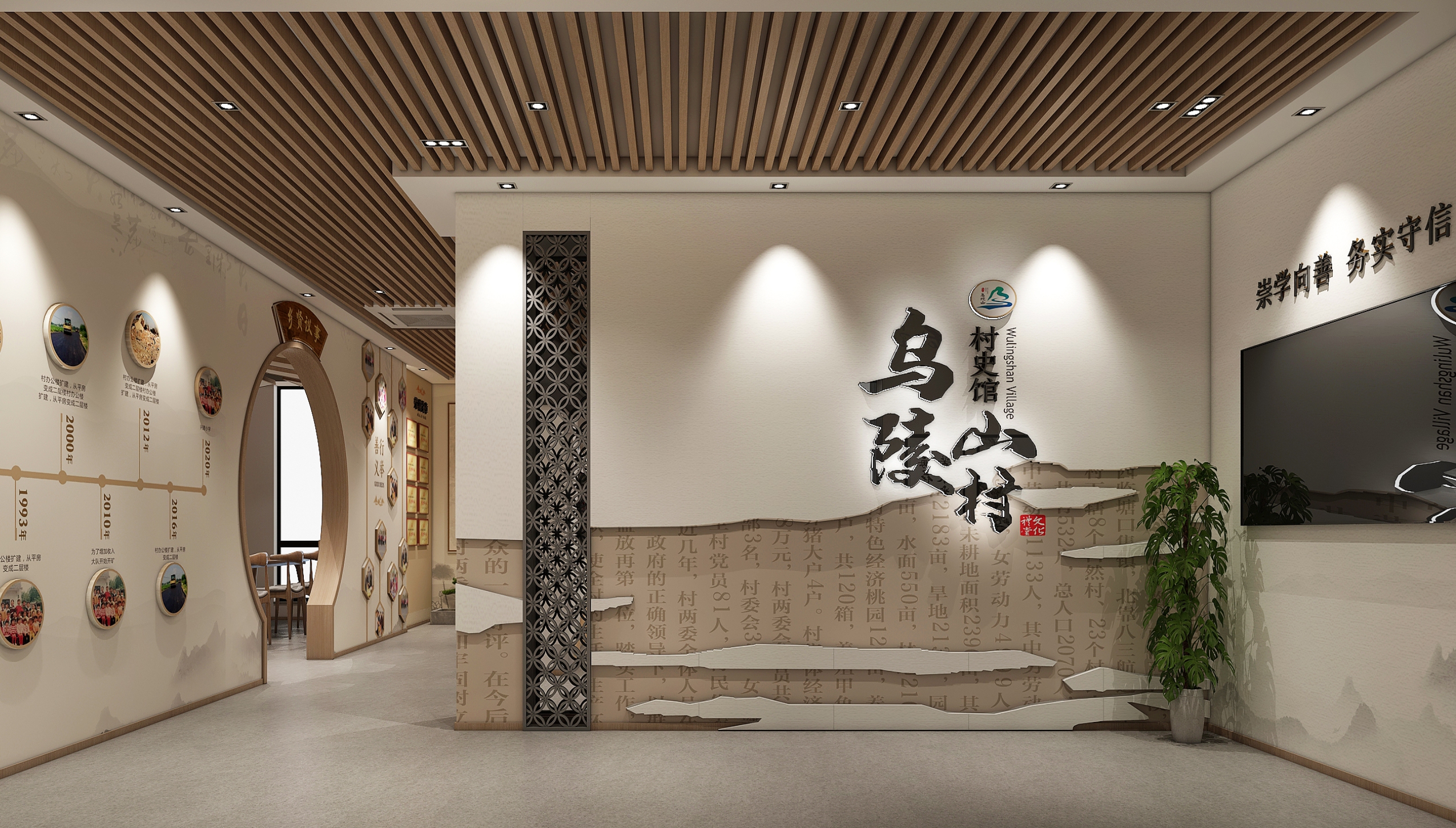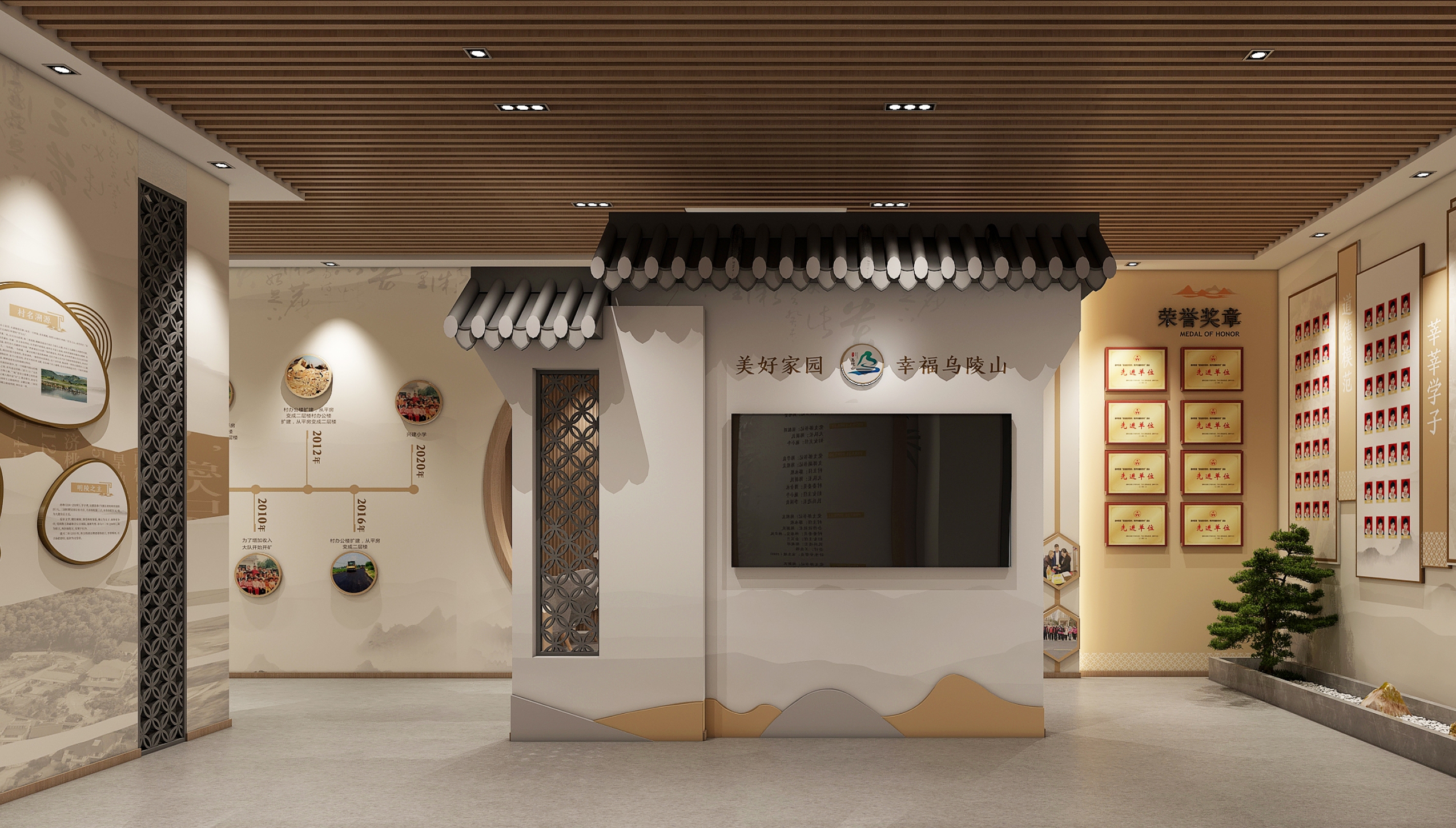 乌陵山村幸福邻里中心,共四层楼,是集服务居民、议事协商和组织培训三大职能为一体的公共空间。 本设计方案是以乌陵山村为设计对象,对其进行升级改造。以乌陵山村为背景,结合村文化底蕴和公共开放空间,使乌陵山村幸福邻里中心空间划分明确,但又相互有机连接。在设计风格上,结合了乌陵山的地域特色及文化背景,打造以山水文化为主的新中式风格,融入乌陵山特色元素。 乌陵山村幸福邻里中心根据所需,每层楼划分有各种功能区,根据区域主题设计了相应的文化装饰布置。